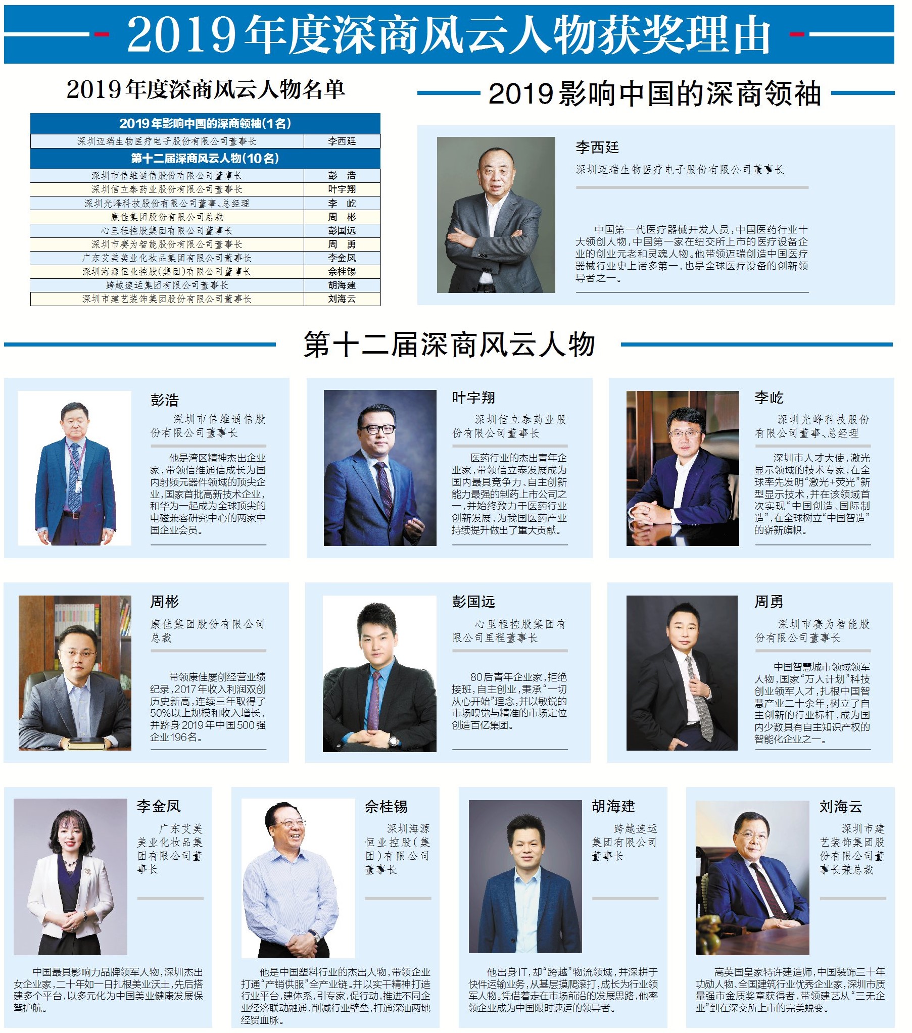 12月22日,被譽(yù)為深商經(jīng)濟(jì)奧斯卡大獎(jiǎng)的“深商風(fēng)云人物”評選榜單新鮮出爐,邁瑞集團(tuán)董事長李西廷被評為2019年“影響中國的深商領(lǐng)袖”;信維通信董事長彭浩,信立泰藥業(yè)董事及總經(jīng)理葉宇翔,光峰科技創(chuàng)始人、董事長李屹,康佳集團(tuán)總裁周彬,心里程控股集團(tuán)有限公司董事長彭國遠(yuǎn),深圳市賽為智能股份有限公司董事長周勇,廣東艾美美業(yè)化妝品集團(tuán)有限公司董事長李金鳳,深圳海源恒業(yè)控股(集團(tuán))有限公司董事長佘桂錫,跨越速運(yùn)集團(tuán)有限公司董事長胡海建,深圳市建藝裝飾集團(tuán)股份有限公司董事長劉海云10位企業(yè)家被評為第十二屆“深商風(fēng)云人物”。