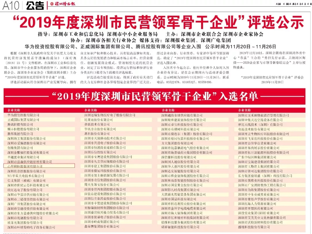 11月20日,深圳特區(qū)報A10版公示了“2019年度深圳市民營領軍骨干企業(yè)”入選名單,共100家包括華為投資控股有限公司、正威國際有限公司、騰訊控股有限公司、心里程控股集團有限公司等企業(yè)入圍。