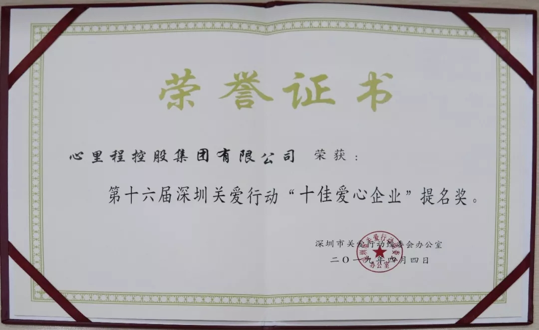 心里程集團(tuán)榮獲第十六屆深圳關(guān)愛行動(dòng)“十佳愛心企業(yè)”提名獎(jiǎng)