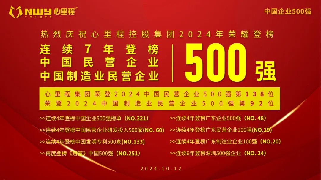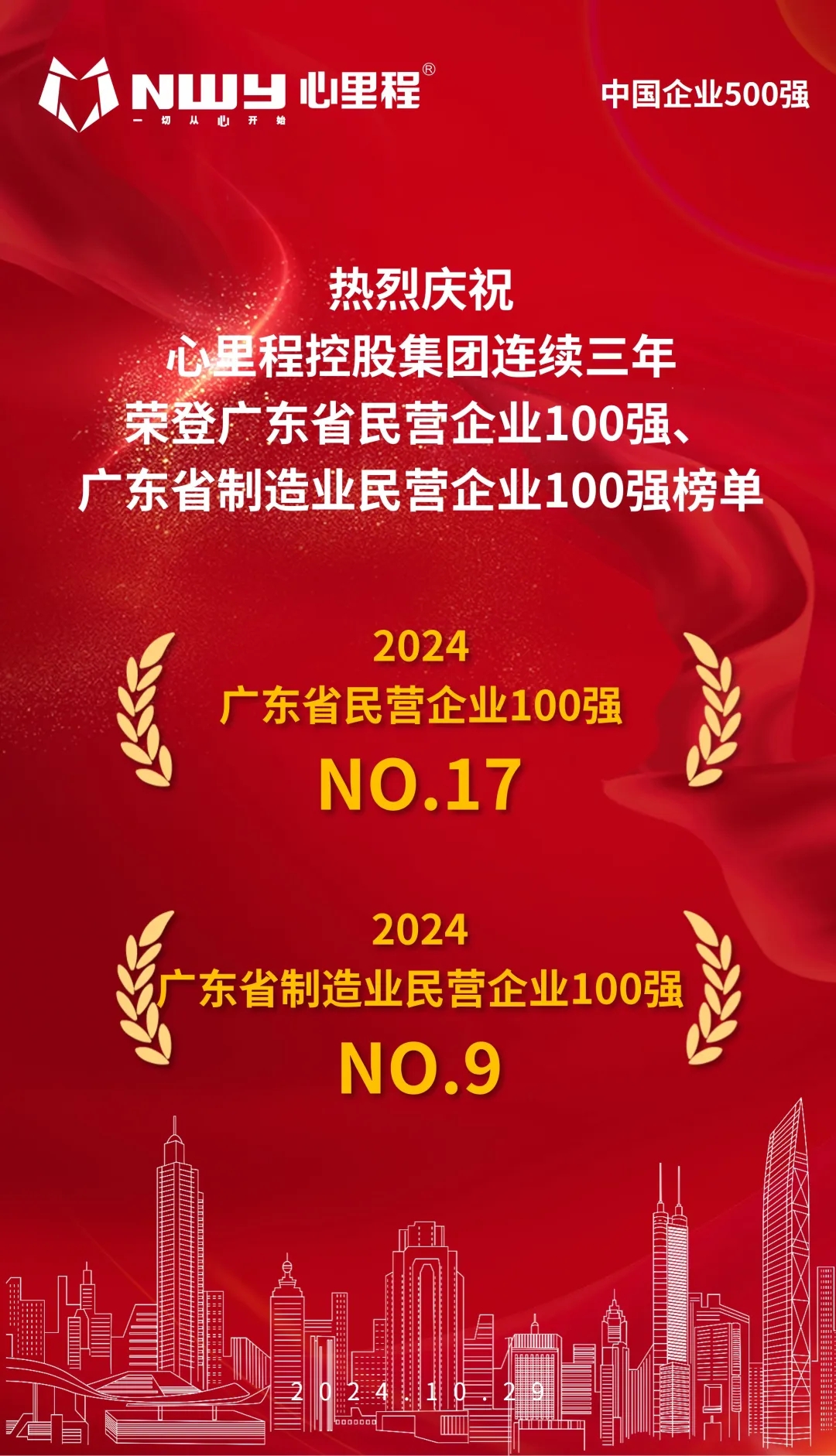 心里程集團(tuán)榮登2024廣東省民營(yíng)企業(yè)100強(qiáng)第17位,制造業(yè)民營(yíng)企業(yè)100強(qiáng)第9位