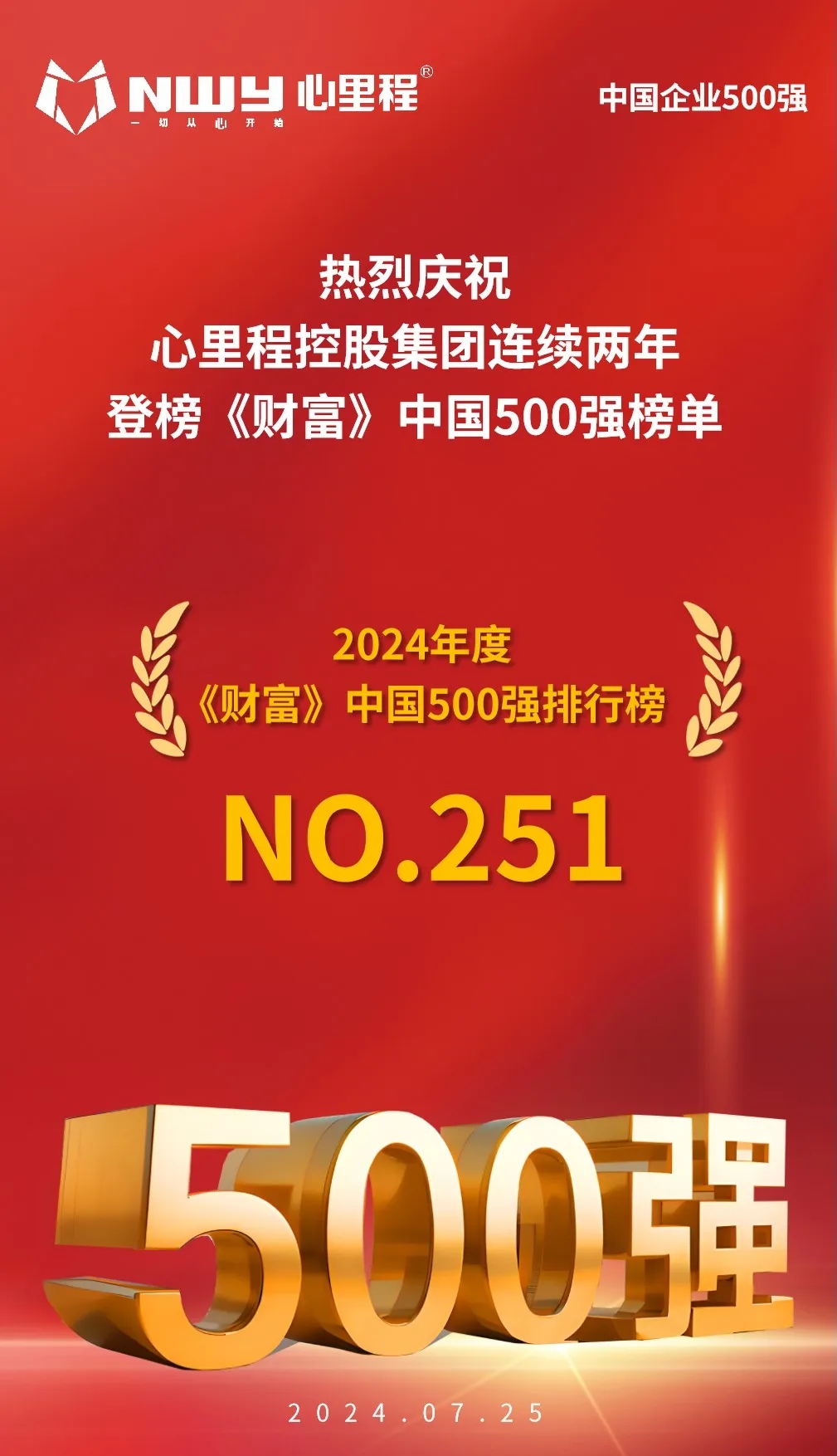 心里程集團榮登 2024年《財富》中國500強榜單第 251位