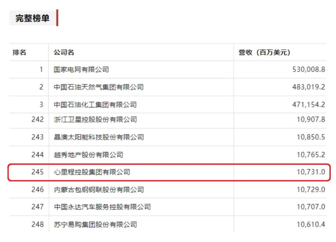 排名第245位!心里程集團(tuán)首登《財(cái)富》中國500強(qiáng)