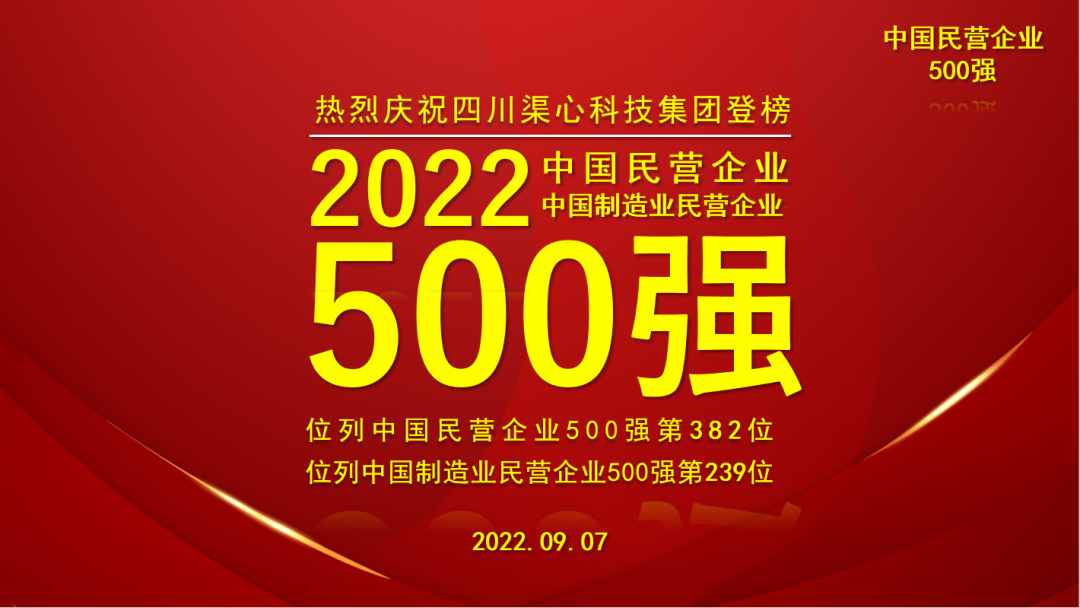 9月7日,全國工商聯(lián)發(fā)布2022中國民營企業(yè)500強榜單。京東集團(tuán)、阿里巴巴(中國)有限公司、恒力集團(tuán)有限公司位居前三強。心里程控股集團(tuán)旗下子集團(tuán)公司——四川渠心科技集團(tuán)有限公司首次榮登2022中國民營企業(yè)500強榜單,位列382位;首次榮登2022中國制造業(yè)民營企業(yè)500強,位列239位。這次共有9家四川民營企業(yè)上榜,四川渠心科技集團(tuán)排行第八。