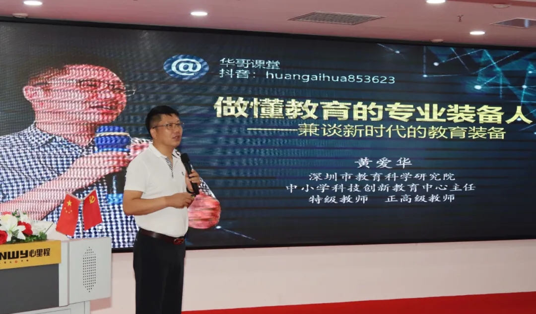 集訓(xùn)期間,集團(tuán)有幸邀請(qǐng)到深圳市教育科學(xué)研究院中小學(xué)科技創(chuàng)新教育中心主任、特級(jí)教師、 正高級(jí)教師黃愛華,為集訓(xùn)營干部作題為《做懂教育的專業(yè)裝備人——兼談新時(shí)代的教育裝備》的講座。