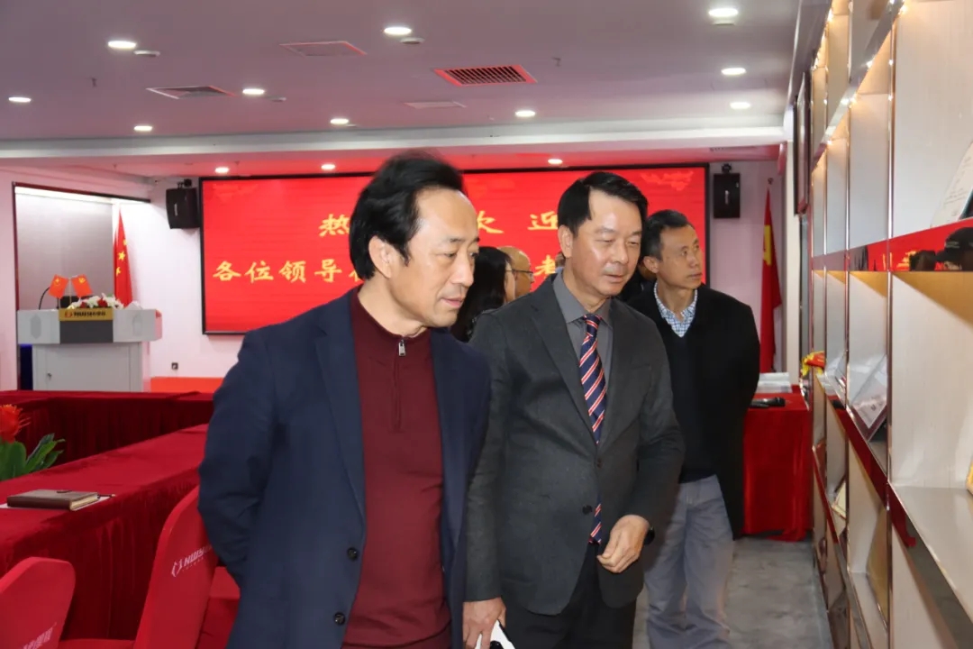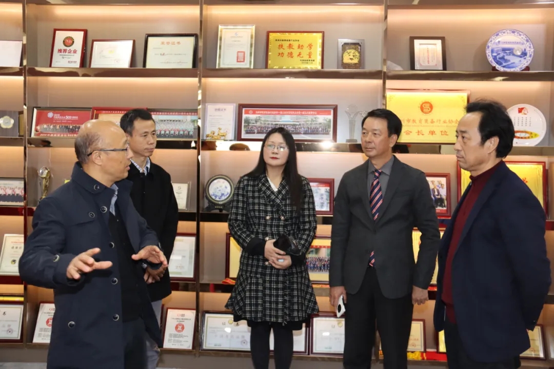 彭錦環(huán)總裁(前排右一)向南山區(qū)政協(xié)副主席、區(qū)教育局局長劉根平(前排右二)介紹心里程集團(tuán)
