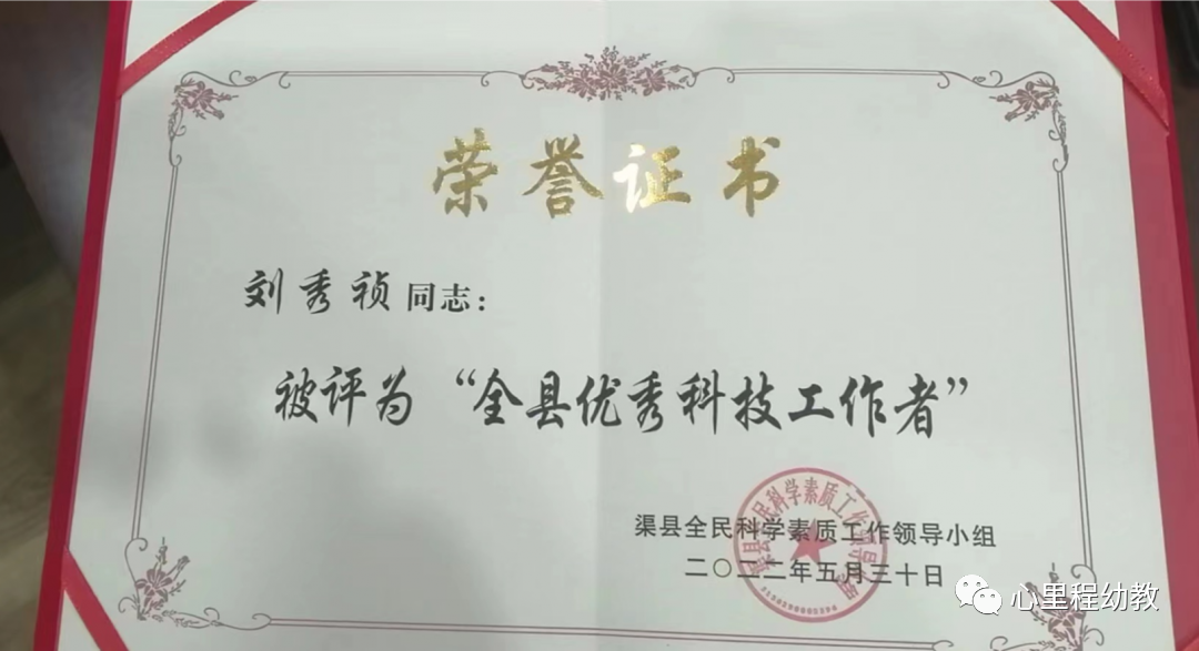 渠縣科協(xié)常委表示,心里程幼教常務副總裁劉秀禎在幼兒科技啟蒙工作方面表現(xiàn)非常優(yōu)秀,在工作崗位上無私奉獻,在創(chuàng)新育兒方向深耕多年,綻放光彩,建議表彰。