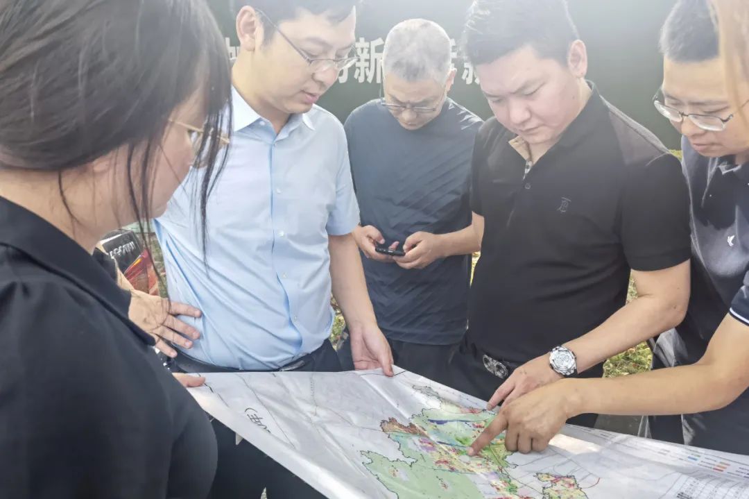 胡藍(lán)副區(qū)長(左二)陪同彭國遠(yuǎn)董事長(右二)考察地塊情況