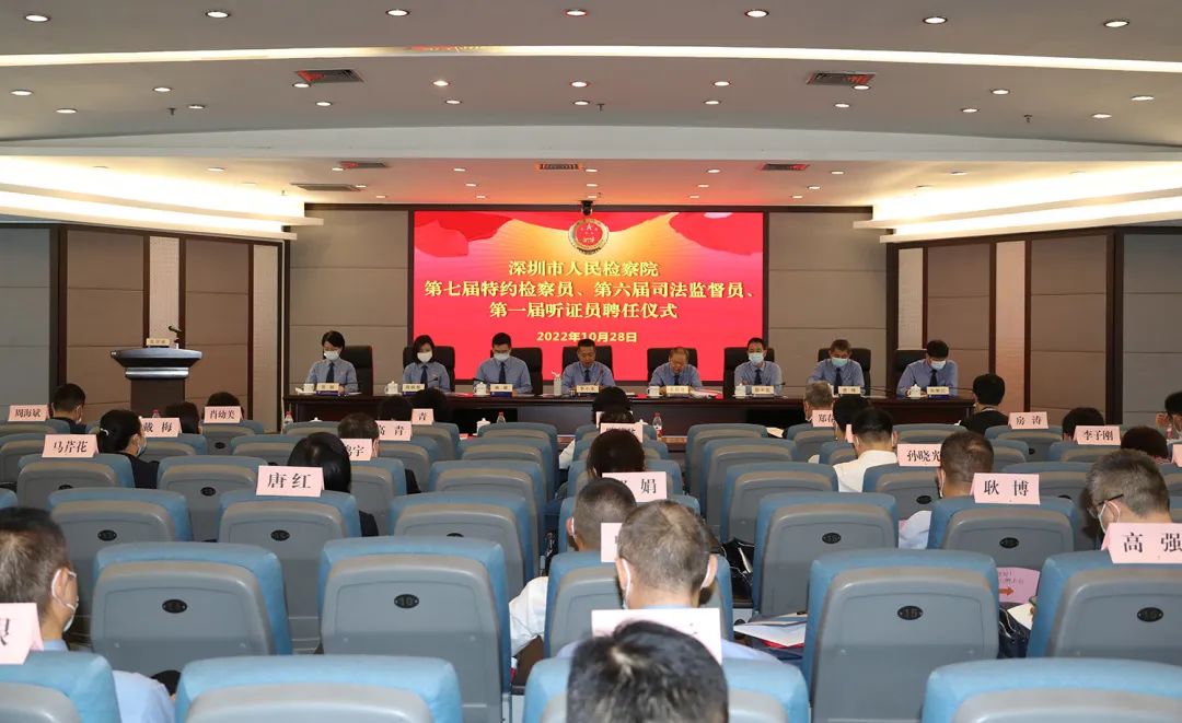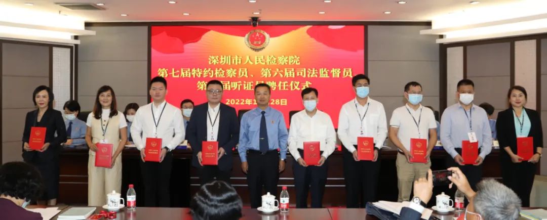經(jīng)深圳市檢察院研究,決定聘請戴梅等29名民主黨派、無黨派、新的社會階層人士為市檢察院第七屆特約檢察員,任期五年;決定聘任馬芹花等99名市人大代表、政協(xié)委員擔(dān)任市檢察院第六屆司法監(jiān)督員,任期五年;決定聘任丁寧等72名各界專業(yè)人士擔(dān)任市檢察院第一屆聽證員,任期自2022年9月29日起至2027年9月29日止。彭國遠(yuǎn)董事長獲聘市檢察院第六屆司法監(jiān)督員。深圳市檢察院黨組書記、檢察長李小東為“三員”代表頒發(fā)聘書。