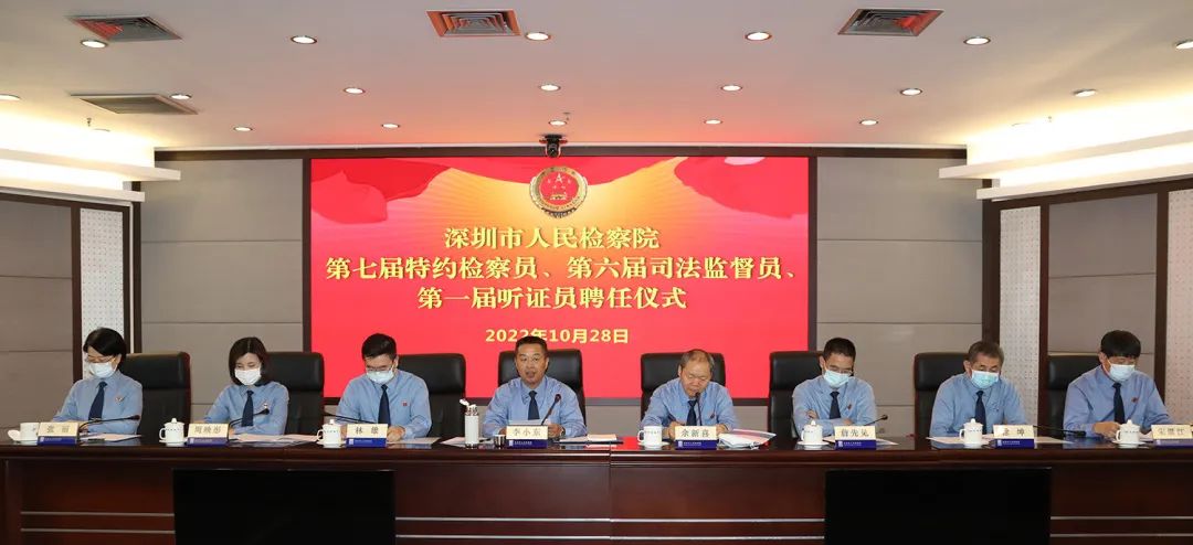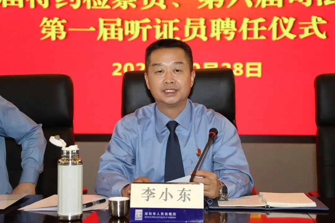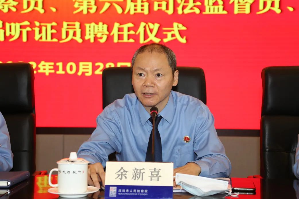 深圳市檢察院黨組副書記、副檢察長余新喜主持本次聘任儀式。他首先對各位來賓表示熱烈歡迎與衷心感謝,并說到,聘任特約檢察員、司法監(jiān)督員、聽證員是貫徹落實(shí)習(xí)近平法治思想、習(xí)近平總書記關(guān)于落實(shí)全過程人民民主以及加強(qiáng)和改進(jìn)統(tǒng)一戰(zhàn)線工作重要思想的一項具體舉措,也是健全檢察外部監(jiān)督制約機(jī)制,深化司法改革,加強(qiáng)檢務(wù)公開的重要保證。