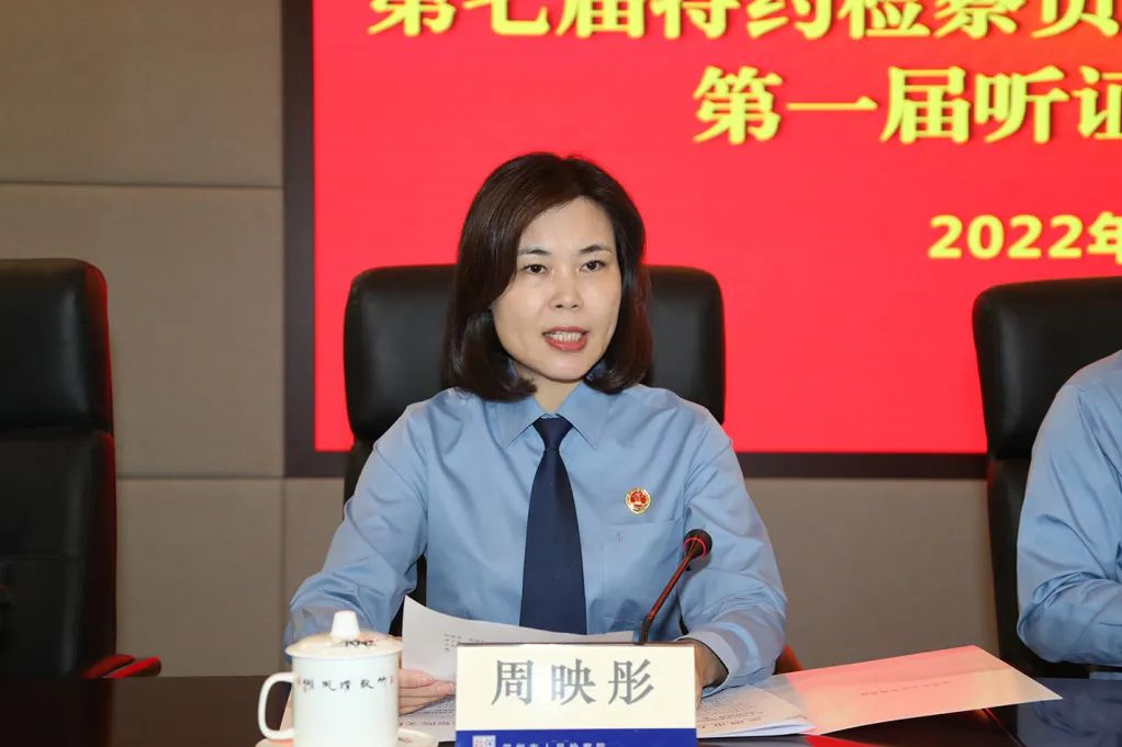 深圳市檢察院黨組成員、副檢察長周映彤依次宣讀《深圳市人民檢察院關(guān)于聘任第七屆特約檢察員的決定》《深圳市人民檢察院關(guān)于聘任第六屆司法監(jiān)督員的決定》《深圳市人民檢察院關(guān)于聘任丁寧等72人為第一屆聽證員的決定》。