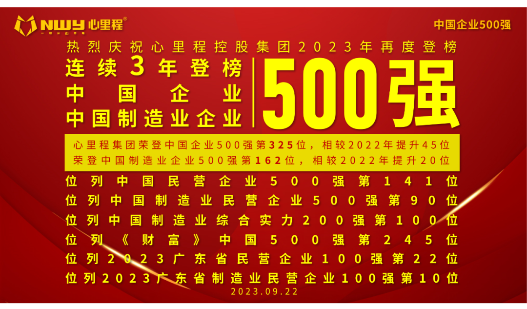 近期,心里程集團可謂喜事連連,捷報頻傳。集團先后榮登“2023中國企業(yè)500強”榜單第325位,較去年上升45位;“2023中國制造業(yè)企業(yè)500強”榜單第162位,較去年上升20位;“2023年中國民營企業(yè)500強”榜單第141位,較去年上升29位;“2023年中國制造業(yè)民營企業(yè)500強”榜單第90位,較去年上升13位;“2023年中國制造業(yè)綜合實力200強”榜單第100位;“2023年《財富》中國500強”榜單第245位;“2023廣東省民營企業(yè)100強”榜單第22位,較去年提升5位;“2023廣東省制造業(yè)民營企業(yè)100強”榜單第10位,較去年提升2位;“2023深圳企業(yè)500強”榜單第27位。