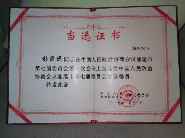 彭國(guó)遠(yuǎn)董事長(zhǎng)榮獲汕尾市委員會(huì)榮譽(yù)證