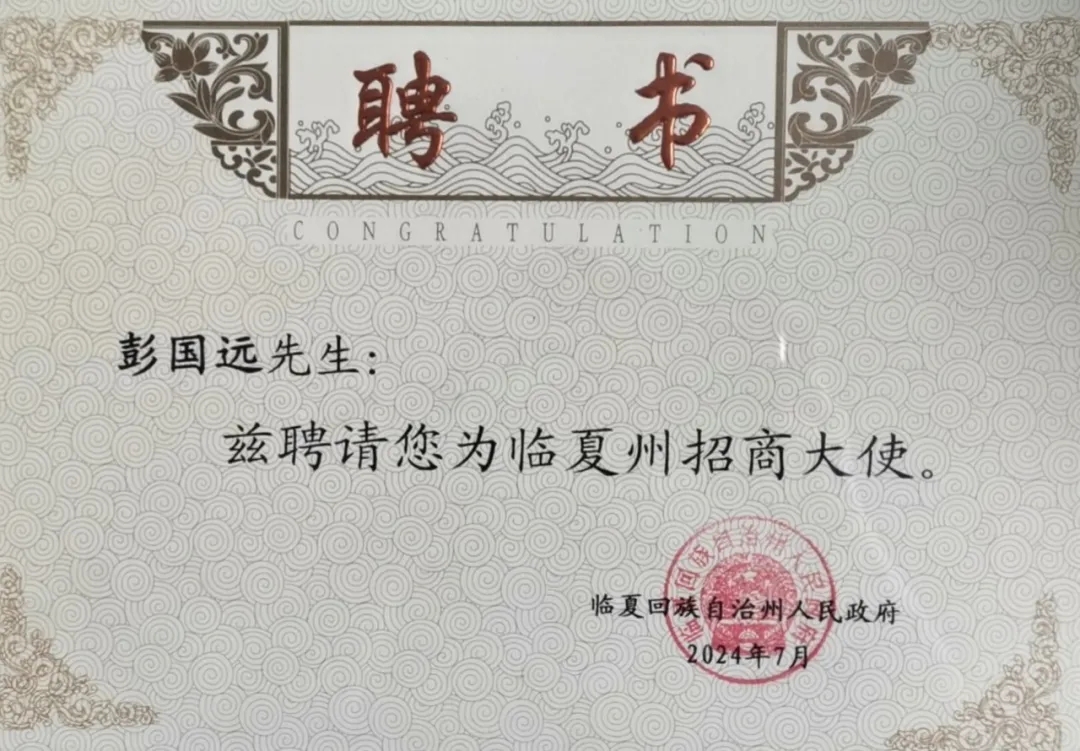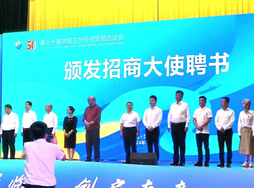 7月5日,第三十屆蘭洽會臨夏州招商引資項目專場簽約儀式在蘭州市舉行,共敘友情、共謀發(fā)展、共話未來。省人大常委會黨組副書記、副主任馬廷禮,省政協(xié)副主席馬文云出席,州委書記李海默致辭,州委副書記、州長何東主持。彭國遠董事長應邀出席活動,并獲聘“臨夏州招商引資大使”。