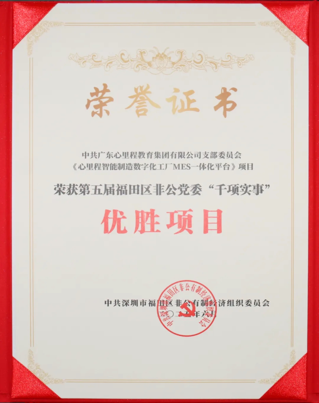 近日,福田區(qū)非公黨委隆重舉行“實(shí)干先鋒”共產(chǎn)黨員及先進(jìn)基層黨組織授牌儀式暨第五屆“千項(xiàng)實(shí)事”項(xiàng)目經(jīng)驗(yàn)交流會(huì)。中共廣東心里程教育集團(tuán)黨支部憑借扎實(shí)的黨建工作與顯著的實(shí)踐成效,榮獲福田區(qū)非公黨委“先進(jìn)基層黨組織”稱號(hào)。同時(shí),由支部申報(bào)的《心里程智能制造數(shù)字化工廠MES一體化平臺(tái)》項(xiàng)目榮膺第五屆福田區(qū)非公黨委“千項(xiàng)實(shí)事”優(yōu)勝項(xiàng)目殊榮。