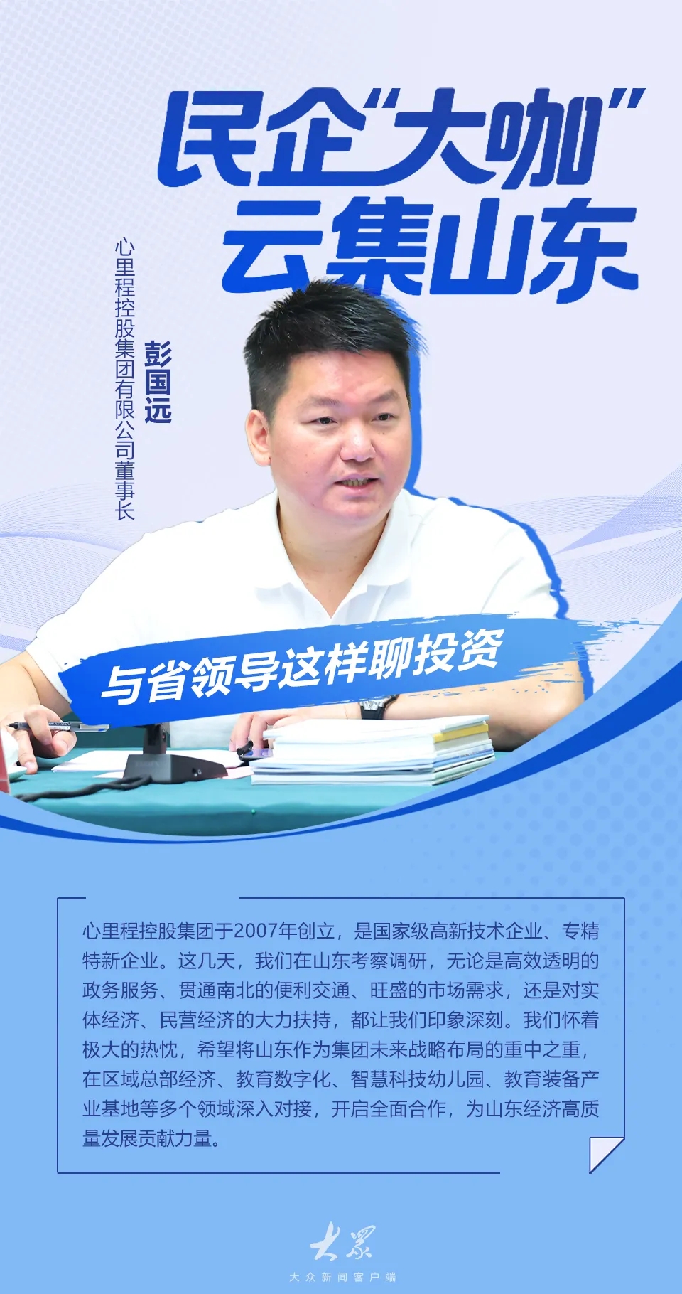 他表示,非常榮幸能在中央統(tǒng)戰(zhàn)部王瑞軍副部長的親自率領(lǐng)下,來到齊魯大地考察調(diào)研、洽談合作。山東是中華優(yōu)秀傳統(tǒng)文化發(fā)源地之一,素有“孔孟之鄉(xiāng),禮儀之邦”的美譽,以齊魯文化而著稱于世。地處“一帶一路”交匯區(qū)域和東北亞區(qū)域經(jīng)濟合作的中心地帶,作為中國的人口大省、文化大省、經(jīng)濟大省、全國首個交通強國省域示范區(qū),山東不僅擁有得天獨厚的區(qū)位優(yōu)勢和雄厚的產(chǎn)業(yè)基礎(chǔ),更是在省委省政府的堅強領(lǐng)導(dǎo)下,打造出了全國領(lǐng)先、有口皆碑的營商環(huán)境。這幾天我們一直在山東考察調(diào)研,無論是高效透明的政務(wù)服務(wù)、貫通南北的便利交通、旺盛的市場需求,還是對實體經(jīng)濟、民營經(jīng)濟的大力扶持,都讓我們印象深刻、充滿向往。正是基于對山東發(fā)展前景的堅定看好和營商環(huán)境的高度認可,我們懷著極大的熱忱,希望將山東作為集團未來戰(zhàn)略布局的重中之重,在區(qū)域總部經(jīng)濟、教育數(shù)字化、智慧科技幼兒園、教育裝備產(chǎn)業(yè)基地、投融資合作等多個領(lǐng)域深入對接,開啟深入而全面的政企合作,為山東經(jīng)濟高質(zhì)量發(fā)展貢獻力量。同時,為了更有效地服務(wù)山東發(fā)展大局,我們非常愿意充分發(fā)揮集團旗下深圳市教育裝備行業(yè)協(xié)會、廣東省商業(yè)創(chuàng)新創(chuàng)業(yè)聯(lián)合會這兩大平臺的優(yōu)勢資源,積極穿針引線,廣泛鏈接粵港澳大灣區(qū)的優(yōu)質(zhì)企業(yè)、項目、技術(shù)和人才,為山東的招商引資、招才引智工作貢獻我們的平臺力量。