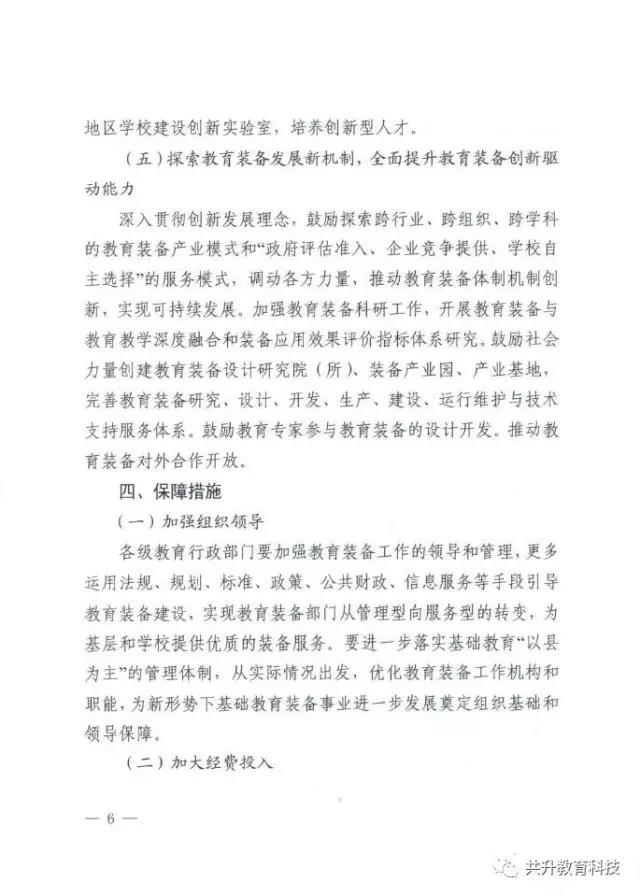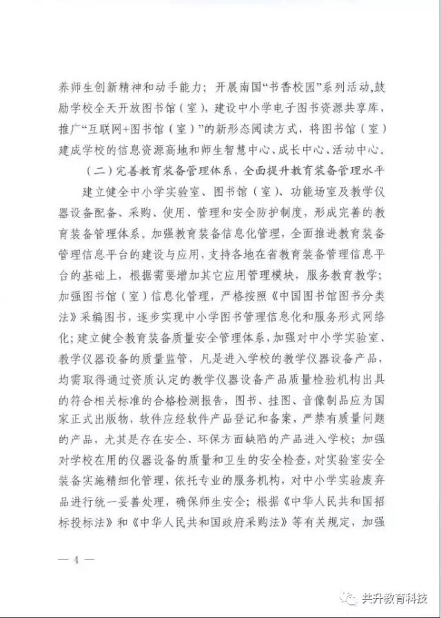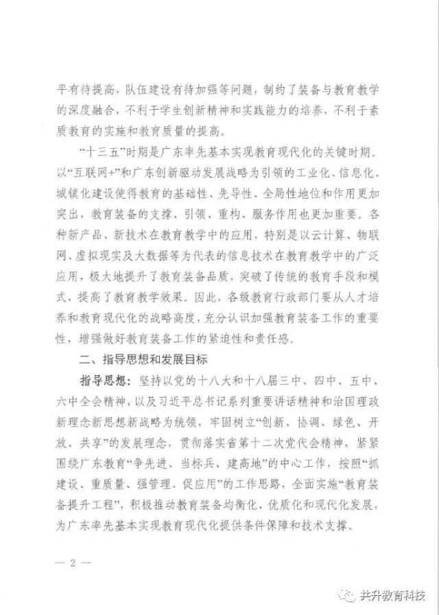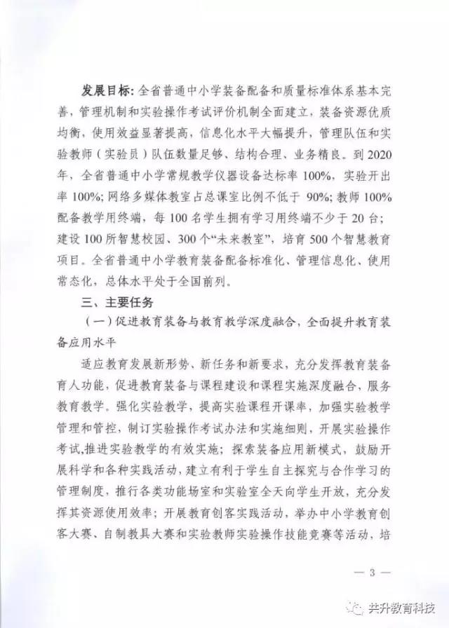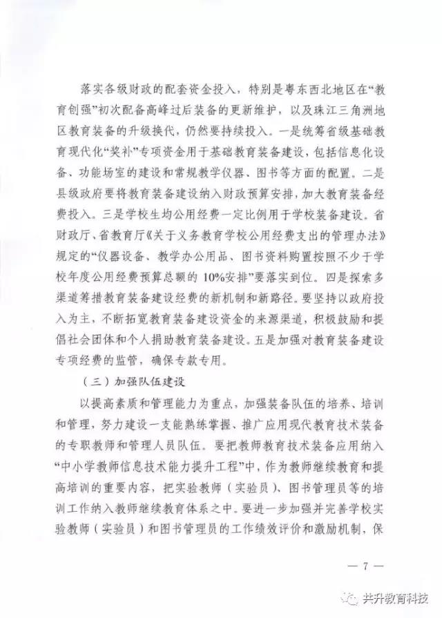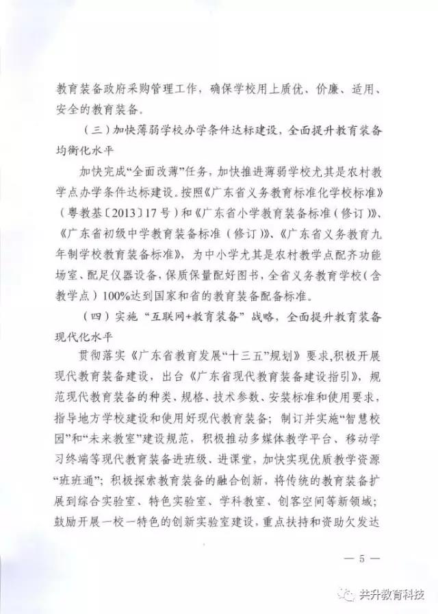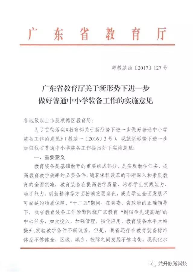 廣東省教育廳于6月29日正式下發(fā)《廣東省教育廳關(guān)于新形勢下進一步做好普通中小學(xué)裝備工作的實施意見》(粵教基函【2017】127號),實施意見發(fā)展目標(biāo)為:全省普通中小學(xué)裝備配備和質(zhì)量標(biāo)準(zhǔn)體系基本完善,管理機制和實驗操作考試評價機制全面建立,裝備資源優(yōu)質(zhì)均衡,使用效益顯著提高,信息化水平大幅提升,管理隊伍和實驗教師(實驗員)隊伍數(shù)量足夠、結(jié)構(gòu)合理、業(yè)務(wù)精良。到2020年,全省普通中小學(xué)常規(guī)教學(xué)儀器設(shè)備達標(biāo)率100%,實驗開出率100%,網(wǎng)絡(luò)多媒體教室占總課室比例不低于90%,教師100%配備教學(xué)用終端,每100名學(xué)生擁有學(xué)習(xí)用終端不低于20臺,建設(shè)100所智慧校園、300個未來教室,培育500個智慧教育項目。全省普通中小學(xué)教育裝備標(biāo)準(zhǔn)化、管理信息化、使用常態(tài)化,總體水平處于全國前列。(以下為文件內(nèi)容)