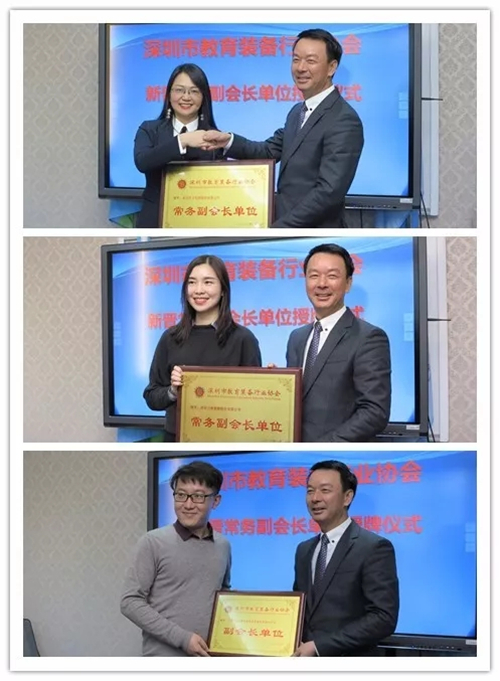 會后,在王富會長、夏國明副會長兼秘書長的見證下,彭錦環(huán)會長/總裁為深圳市教育裝備行業(yè)協(xié)會新晉常務(wù)副會長單位——深圳市眾投邦股份有限公司、深圳市大熊創(chuàng)新股份有限公司,副會長單位——北京世紀(jì)超星信息技術(shù)發(fā)展有限責(zé)任公司進(jìn)行了授牌。