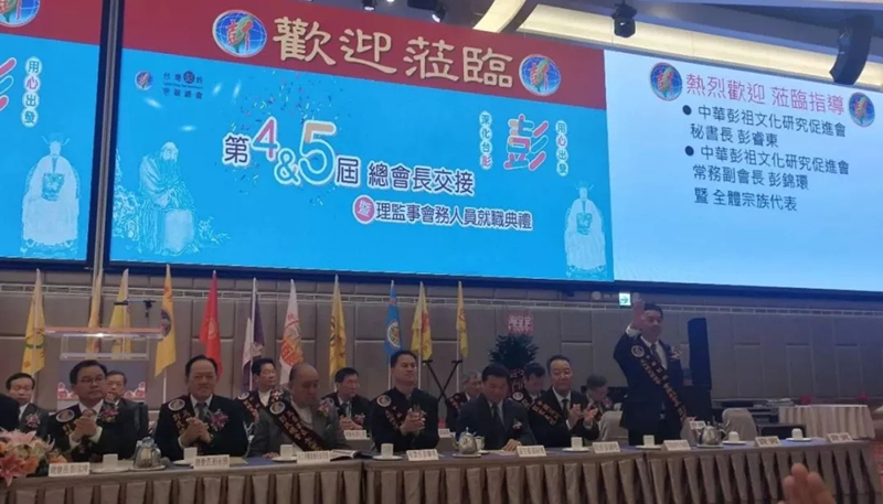 3月31日,心里程教育集團總裁彭錦環(huán),作為中華彭祖文化研究促進會常務(wù)副會長,應(yīng)邀前往臺灣參加參加臺灣彭姓宗親總會第4&5屆總會長交接暨理監(jiān)事會務(wù)人員就職典禮和臺灣新北市彭姓宗親會第八、九屆理事長交接暨理監(jiān)事、會職員就職典禮。