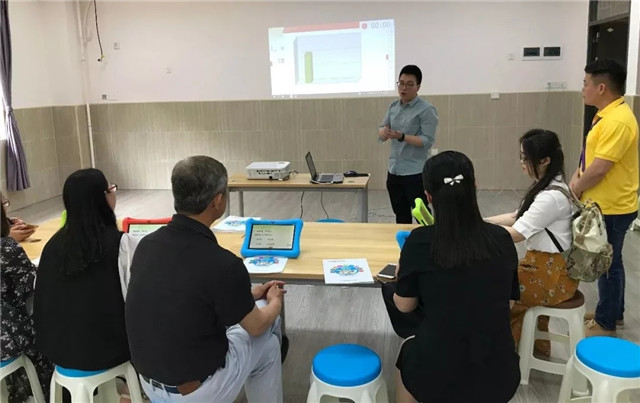 心里程教育集團(tuán)的工程師們現(xiàn)場為校長們演示“互聯(lián)e課堂”平板電腦的使用方法,并講解特色功能。