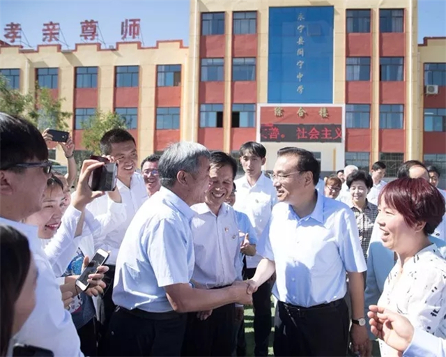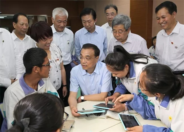 6月4日,李克強(qiáng)總理在寧夏銀川市永寧縣閩寧中學(xué)考察“互聯(lián)網(wǎng)+教育”發(fā)展?fàn)顩r。寧夏通過打造教育資源公共服務(wù)平臺,全區(qū)中小學(xué)?;ヂ?lián)網(wǎng)接入率已達(dá)到100%。在該校的“智慧教室”,學(xué)生們?nèi)耸忠粋€平板電腦,向總理展示上面集成的優(yōu)質(zhì)教育課件和彼此分享的學(xué)習(xí)心得。
