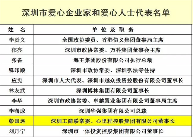 6月29日,在廣東扶貧濟(jì)困日前夕,廣東省委常委、深圳市委書記王偉中,深圳市委副書記、市長(zhǎng)陳如桂等領(lǐng)導(dǎo)親切會(huì)見了各界愛心企業(yè)家和愛心人士代表,并召開座談會(huì)。心里程控股集團(tuán)有限公司董事長(zhǎng)彭國(guó)遠(yuǎn)應(yīng)邀出席會(huì)議并發(fā)言。