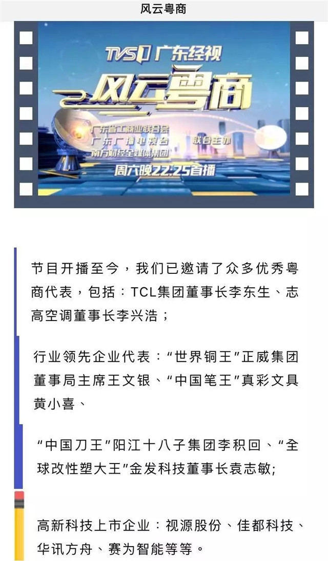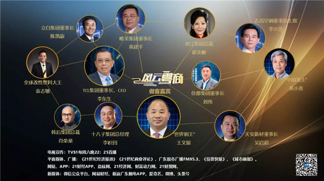 開播至今,《風云粵商》已邀請到眾多優(yōu)秀粵商代表,包括:TCL集團董事長李東生、志高空調(diào)董事長李興浩;行業(yè)領(lǐng)先企業(yè)代表:“世界銅王”正威集團董事局主席王文銀、“中國筆王”真彩文具黃小喜、“中國刀王”陽江十八子集團李積回、“全球改性塑大王”金發(fā)科技董事長袁志敏;高新科技上市企業(yè):視源股份、佳都科技、華訊方舟、賽為智能;“獨角獸”企業(yè):云從科技等。