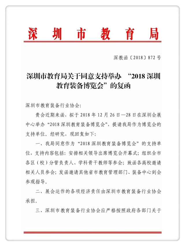 博覽會得到了中國教育裝備行業(yè)協(xié)會,廣東省教育廳,深圳市教育局的大力支持,確保了展覽會的官方權(quán)威性和專業(yè)性。