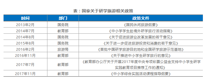 1、政策推動(dòng),研學(xué)旅游上升到國(guó)家戰(zhàn)略2016年11月,教育部聯(lián)合國(guó)家發(fā)改委、旅游局等11部門(mén)發(fā)布了《關(guān)于推進(jìn)中小學(xué)生研學(xué)旅行的意見(jiàn)》,《意見(jiàn)》明確指出,要將研學(xué)旅行納入中小學(xué)教育教學(xué)計(jì)劃,加強(qiáng)研學(xué)旅行基地建設(shè),并對(duì)組織管理、安全責(zé)任體系和經(jīng)費(fèi)籌措機(jī)制進(jìn)行了詳細(xì)闡述。研學(xué)旅行已由促進(jìn)旅游業(yè)發(fā)展的單一角度,上升到全面提高中小學(xué)生綜合素質(zhì)教育的國(guó)家戰(zhàn)略高度。