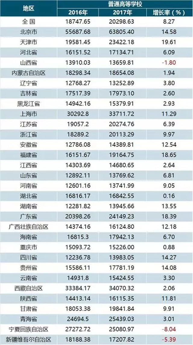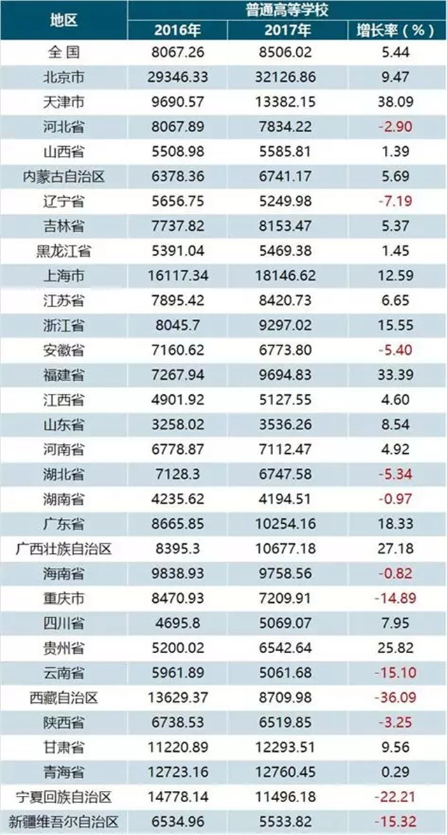 從普通高校來看,2017年全國普通高校一般公共預(yù)算教育事業(yè)費為20298.63億元,較上年增長8.27%,增長最快的是天津市(19.61%);2017年全國普通高等學(xué)校一般公共預(yù)算公用經(jīng)費支出為8506.02元,比上年的8067.26元增長5.44%。增長最快的是天津市(38.09%)。