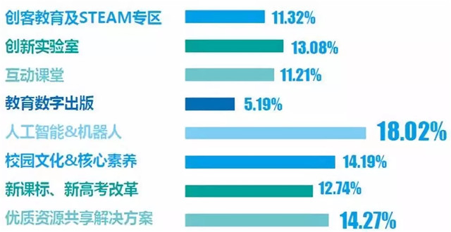 其中,通過SmartShow國際智慧教育展覽會各院校報名用戶調(diào)研數(shù)據(jù),真實反饋出教育科技產(chǎn)品趨勢。人工智能&機器人、優(yōu)質(zhì)資源共享解決方案占比最高,校園文化&核心素養(yǎng)緊隨其后,可見教育采購趨勢發(fā)生大轉(zhuǎn)變,看似遙遠的人工智能將改變傳統(tǒng)教育模式,而這將是行業(yè)發(fā)展的加速時期。