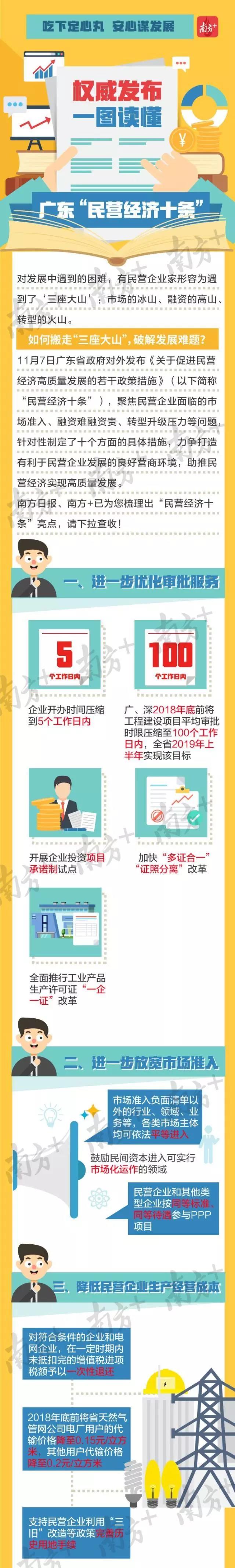 二、聚焦發(fā)展痛點,持續(xù)降低民營企業(yè)成本負擔。針對民營企業(yè)反映突出的成本高、融資難等問題,這方面主要是解決兩個問題:一是提出降費再加碼,在不折不扣落實國家現(xiàn)有稅費政策的基礎上,進一步降氣價,2018年底前天然氣輸氣價格每立方降低0.15至0.2元。大家不要小看這0.15至0.2元,因為廣東用氣量很大,而且對廣東傳統(tǒng)產業(yè)轉型升級的推動非常大,企業(yè)的成本可以降低很多。同時要進一步降社保,企業(yè)用工情況發(fā)生變化的,可以依法申報社會保險費增減變化情況,而且馬省長再三表態(tài),今年社保的繳交標準跟去年一樣,明年跟今年也一樣,不會變;進一步降地價,支持民營企業(yè)利用“三舊”改造等政策完善歷史用地手續(xù)。這些都是“干貨”,都是民營企業(yè)迫切需要解決的一些問題。二是加大融資支持力度,鼓勵銀行機構為小微企業(yè)提供無還本續(xù)貸,支持各地設立小微企業(yè)轉貸基金,解決企業(yè)融資難、融資貴的問題;積極推廣銀稅合作,擴大參與銀行機構的范圍和質量;積極推動中小企業(yè)應收賬款融資;完善知識產權質押融資風險補償和信用擔保機制;鼓勵各地推進中小企業(yè)設備融資租賃。除了這些內容之外,為了解決在融資難融資貴的問題,真正聽取廣大民營企業(yè)家的實實在在的意見,還要再破解一些融資難融資貴的具體問題。