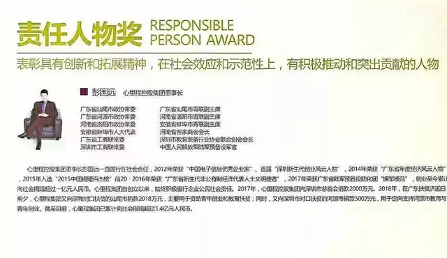 近日,在2018中華企業(yè)社會責任盛典活動中傳來喜訊,心里程集團彭國遠董事長榮獲2018年中華企業(yè)社會責任盛典“責任人物獎”。 |