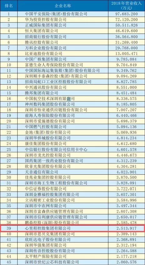 由深圳市企業(yè)聯(lián)合會、深圳市企業(yè)家協(xié)會(以下簡稱深圳企聯(lián))編撰的《2019深圳500強(qiáng)企業(yè)發(fā)展報(bào)告》即將正式對外發(fā)布。《2019深圳500強(qiáng)企業(yè)發(fā)展報(bào)告》中的“2019深圳500強(qiáng)企業(yè)”名單于今日在《深圳商報(bào)》予以公示,心里程控股集團(tuán)排名第39位,比較去年前進(jìn)了27名。