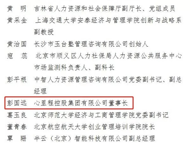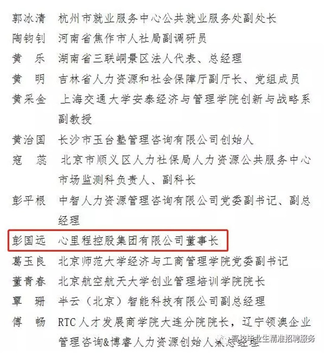 為進(jìn)一步健全和完善高校畢業(yè)生就業(yè)創(chuàng)業(yè)服務(wù)體系,充分發(fā)揮專家團(tuán)隊在就業(yè)創(chuàng)業(yè)服務(wù)領(lǐng)域的積極作用,更好地為高校畢業(yè)生提供多方位指導(dǎo)和精細(xì)化服務(wù),提升其就業(yè)創(chuàng)業(yè)競爭力,促進(jìn)更加充分和更高質(zhì)量就業(yè),日前,人力資源社會保障部全國人才流動中心公布了68位全國人才流動中心高校畢業(yè)生就業(yè)創(chuàng)業(yè)指導(dǎo)專家的名單,心里程控股集團(tuán)董事長彭國遠(yuǎn)入選。