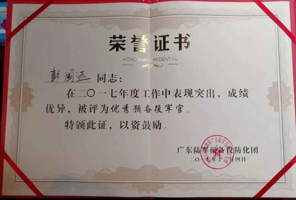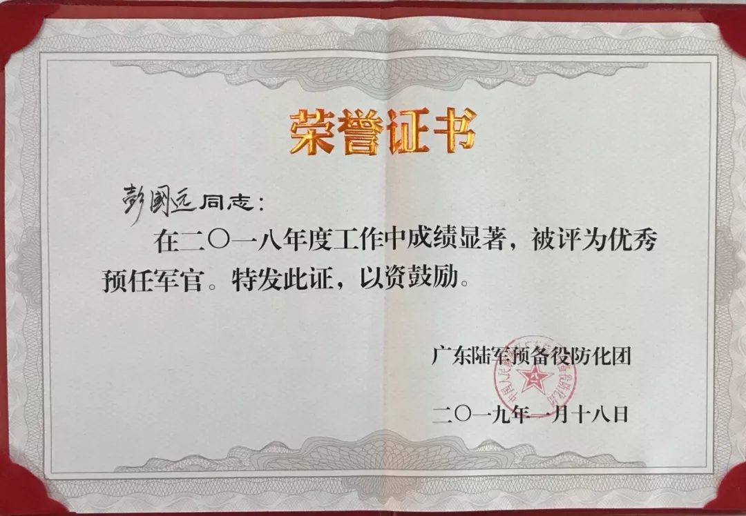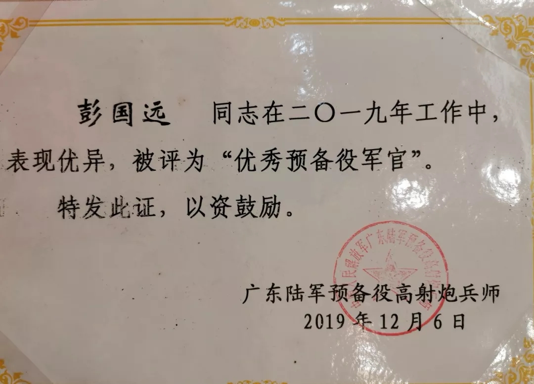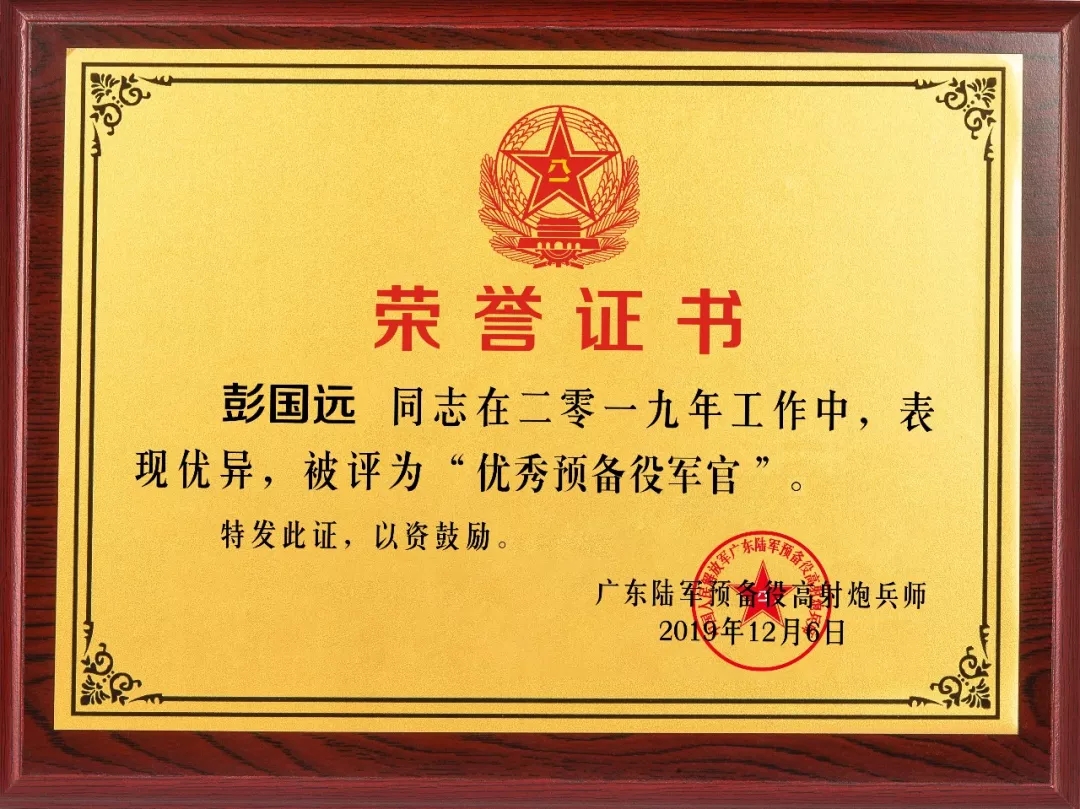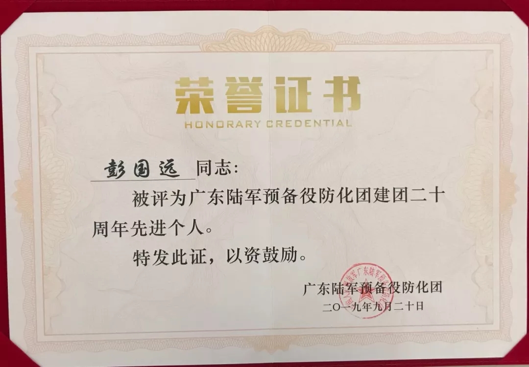 2019彭國遠(yuǎn)榮獲廣東陸軍預(yù)備役防化團(tuán)建團(tuán)二十周年先進(jìn)個人