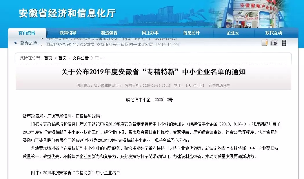 2019年度安徽省“專精特新”中小企業(yè)名單