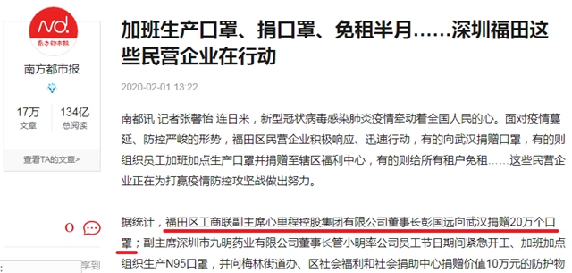 1月底,深圳市福田區(qū)工商聯(lián)副主席、心里程控股集團(tuán)有限公司董事長(zhǎng)彭國(guó)遠(yuǎn)向武漢捐贈(zèng)口罩20萬(wàn)個(gè)。