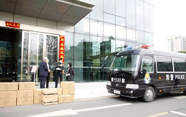 肇慶市派車(chē)于心里程控股集團(tuán)總部接收6萬(wàn)余件醫(yī)用物品捐贈(zèng)