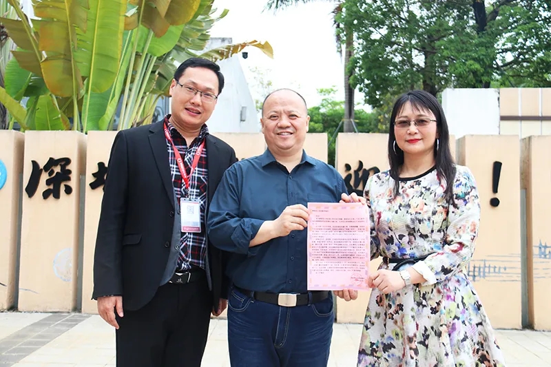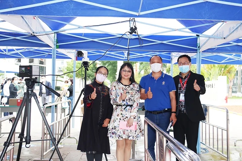 深圳第二外國(guó)語(yǔ)學(xué)校的總務(wù)處主任李海波、辦公室主任劉淑艷與搭建驗(yàn)收完成的“熱成像人體測(cè)溫初篩系統(tǒng)”合影留念,并為心里程和深圳市教育裝備行業(yè)協(xié)會(huì)助力教育系統(tǒng)打好疫情防控攻堅(jiān)戰(zhàn)的善舉點(diǎn)贊。