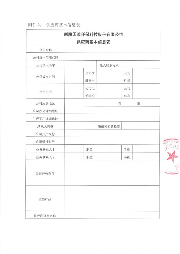 為規(guī)范西藏國策環(huán)保科技股份有限公司(以下簡稱國策環(huán)?;蚬荆┎少徯袨?,加強采購管理,維護公司采購當事人的合法權(quán)益,更好地與廣大供應(yīng)商合作,依據(jù)公司采購管理、供應(yīng)商管理有關(guān)制度的規(guī)定,公司現(xiàn)征集采購供應(yīng)商入庫登記,以建立規(guī)范完整的供應(yīng)商信息庫。歡迎各企業(yè)(供應(yīng)商)踴躍入庫,現(xiàn)將有關(guān)事宜通知如下: